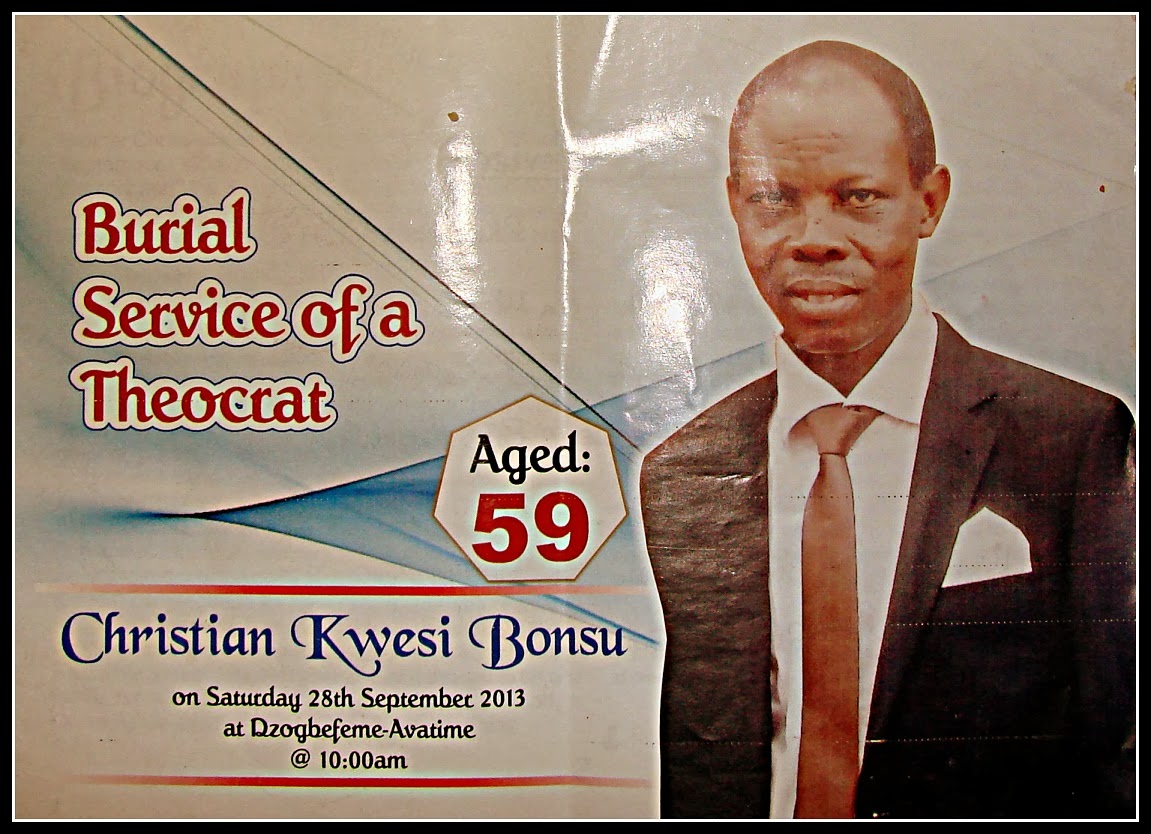 Hvis du læste det første indslag på min blog så ved du at en stor del af det ikke at føle sig for usikker og alene i det fremmede er baseret på at vi som Jehovas Vidner har brødre og søstre overalt i verden. Og det gælder ikke kun for en midaldrende småfed hvid mand der er faret vild helt ned til Afrika, men for hver eneste af de indtil nu 8 millioner Vidner der findes over hele jorden. Og det er også sandt for Broder Christian Kwesi Bonsu som døde tidligere på måneden på Regionshospitalet her i Ho. Broder Bonsu har boet i Nigeria i mere end 30 år, men han er oprindelig fra Avatime området. Han blev et Jehovas Vidne tilbage i 1979 og har siden hen tjent som ældste i en af menighederne i Lagos. Jeg talte med et par af hans medældste, der var kommet fra Nigeria til begravelsen. Og de fortalte mig at Christian havde været som en far for alle i deres menighed. De nævnte også at blot et enkelt mildt ord fra ham kunne køle den mest hede debat ned i det ældsteråd hvori hans tjente som ordstyrer.